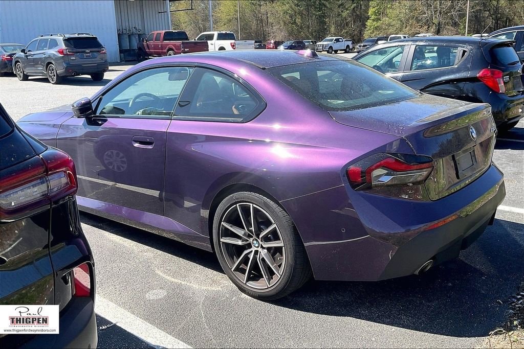 Priced below KBB Fair Purchase Price! Certified. Thundernight Metallic 2024 BMW 2 Series 230i RWD 8-Speed Automatic Sport 2.0L I4 16V TwinPower Turbo Ford Blue Certification Certified, 10 Speakers, 4-Wheel Disc Brakes, ABS brakes, Active Park Distance Control, Adaptive Full LED Lights, Air Conditioning, Alloy wheels, AM/FM radio: SiriusXM, Ambient Lighting, Apple CarPlay & Android Auto Compatibility, Auto-dimming door mirrors, Auto-dimming Rear-View mirror, Automatic High Beams, Automatic temperature control, BMW Assist eCall, BMW TeleServices, Brake assist, Bumpers: body-color, Comfort Access Keyless Entry, ConnectedDrive Services, Delay-off headlights, Driver door bin, Driver vanity mirror, Dual front impact airbags, Dual front side impact airbags, Electronic Stability Control, Emergency communication system: BMW Assist eCall, Exterior Parking Camera Rear, Four wheel independent suspension, Front anti-roll bar, Front Bucket Seats, Front Center Armrest, Front dual zone A/C, Front reading lights, Front Sport Seats, Fully automatic headlights, harman/kardon Surround Sound System, Heated door mirrors, Heated Front Seats, Heated Steering Wheel, Hi-Fi Sound System, Illuminated entry, Knee airbag, Leather Shift Knob, Live Cockpit Pro, Low tire pressure warning, Lumbar Support, Memory seat, Moonroof, Navigation, Navigation System, Occupant sensing airbag, Outside temperature display, Overhead airbag, Panic alarm, Parking Assistance Package, Parking Assistant Plus, Passenger door bin, Passenger vanity mirror, Perforated Sensatec Upholstery, Power door mirrors, Power driver seat, Power Front Seats, Power passenger seat, Power steering, Power windows, Premium Package, Radio data system, Radio: AM/FM Audio System, Rain sensing wipers, Rear air conditioning, Rear anti-roll bar, Rear window defroster, Rear-View Camera, Remote Engine Start, Remote keyless entry, Security system, SiriusXM Satellite Radio, Speed control, Speed-sensing steering, Speed-Sensitive Wipers, Split folding rear seat, Sport steering wheel, Steering wheel mounted audio controls, Surround View w/3D View, Tachometer, Telescoping steering wheel, Tilt steering wheel, Traction control, Trip computer, Turn signal indicator mirrors, Universal Garage-Door Opener, Variably intermittent wipers, Wheels: 18" x 7.5" V-Spoke Bi-Color (Style 780), Widescreen Display.