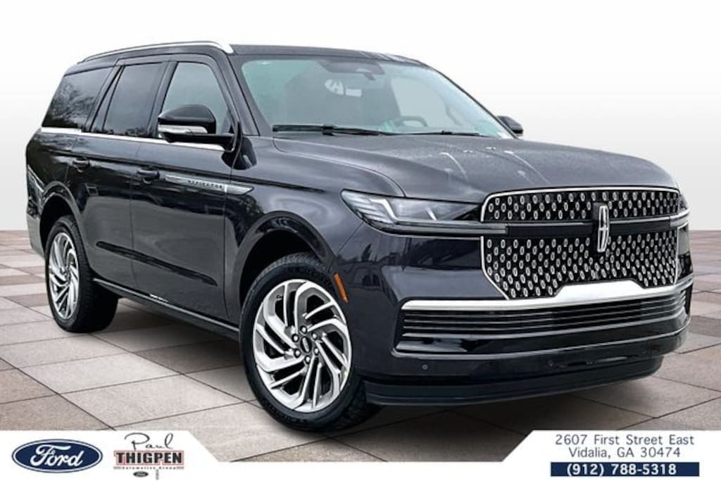 Starlight Gray Premium Colorant 2026 Lincoln Navigator Reserve 4WD 10-Speed Automatic 3.5L V6 Vidalia Ford Lincoln 2607 E 1st St Vidalia, Georgia 30474 912-788-5318 Equipment Group 202A Reserve II (Auto Heated/Ventilated Premium Leather Captain's Chairs, BlueCruise Equipped (4-Years Included), Lincoln App, Lincoln Digital Experience, Radio: Revel Ultima 3D Audio System, SiriusXM with 360L (3 Months Trial), and Wheels: 22" Dark Tarnished Aluminum), Heavy-Duty Trailer Tow Package (26mm Engine Radiator and Trailer Brake Controller), Lincoln Connectivity Package (4-Years Included), Lincoln Security Package, 4WD, Hot Chocolate Leather, 28 Speakers, 3rd row seats: split-bench, 4-Wheel Disc Brakes, ABS brakes, Adaptive suspension, Air Conditioning, Alloy wheels, AM/FM radio: SiriusXM with 360L, Apple CarPlay/Android Auto, Audio memory, Auto High-beam Headlights, Auto Start-Stop Technology, Auto tilt-away steering wheel, Auto-dimming door mirrors, Auto-dimming Rear-View mirror, Auto-leveling suspension, Automatic temperature control, Brake assist, Bumpers: body-color, Compass, Delay-off headlights, Driver door bin, Driver vanity mirror, Driver's Seat Mounted Armrest, Dual front impact airbags, Dual front side impact airbags, Electronic Stability Control, Emergency communication system: 911 Assist, Exterior Parking Camera Rear, Four wheel independent suspension, Front anti-roll bar, Front Bucket Seats, Front dual zone A/C, Front License Plate Bracket, Front reading lights, Fully automatic headlights, Garage door transmitter, Heated door mirrors, Heated front seats, Heated rear seats, Heated steering wheel, HVAC memory, Illuminated entry, Leather steering wheel, Low tire pressure warning, Memory seat, Navigation system: Connected Navigation (1-year trial), Occupant sensing airbag, Outside temperature display, Overhead airbag, Overhead console, Panic alarm, Passenger door bin, Passenger seat mounted armrest, Passenger vanity mirror, Power adjustable rear head restraints, Power door mirrors, Power driver seat, Power moonroof: Panoramic Vista Roof, Power passenger seat, Power steering, Power windows, Radio data system, Rain sensing wipers, Rear air conditioning, Rear anti-roll bar, Rear audio controls, Rear reading lights, Rear window defroster, Rear window wiper, Reclining 3rd row seat, Remote keyless entry, Security system, Speed control, Speed-sensing steering, Speed-Sensitive Wipers, Split folding rear seat, Spoiler, Steering wheel memory, Steering wheel mounted audio controls, Tachometer, Telescoping steering wheel, Tilt steering wheel, Traction control, Trip computer, Turn signal indicator mirrors, Variably intermittent wipers, and Ventilated front seats. 4WD, Hot Chocolate Leather.