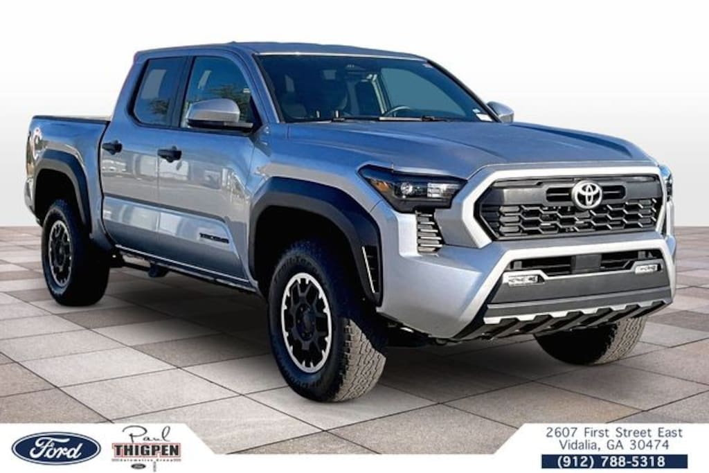 Vidalia Ford Lincoln 2607 E 1st St Vidalia, Georgia 30474 912-788-5318 TRD Off Road Package, Ford Blue Advantage: Blue Certified Certified, 4WD, 3.583 Axle Ratio, 4-Wheel Disc Brakes, 6 Speakers, ABS brakes, Air Conditioning, Alloy wheels, AM/FM radio: SiriusXM, Anti-whiplash front head restraints, Apple CarPlay/Android Auto, Auto High-beam Headlights, Auto-dimming Rear-View mirror, Automatic temperature control, Brake assist, Bumpers: body-color, Driver door bin, Driver vanity mirror, Dual front impact airbags, Dual front side impact airbags, Electronic Stability Control, Emergency communication system: Safety Connect (1-year trial), Exterior Parking Camera Rear, Fabric Seat Trim (FD), Four wheel independent suspension, Front anti-roll bar, Front Bucket Seats, Front Center Armrest, Front fog lights, Front reading lights, Fully automatic headlights, Heated door mirrors, Illuminated entry, Knee airbag, Leather Shift Knob, Leather steering wheel, Low tire pressure warning, Occupant sensing airbag, Outside temperature display, Overhead airbag, Overhead console, Panic alarm, Passenger door bin, Passenger vanity mirror, Power door mirrors, Power steering, Power windows, Radio: 8" Toyota Audio Multimedia, Rear step bumper, Rear window defroster, Remote keyless entry, Security system, Speed control, Speed-sensing steering, Split folding rear seat, Steering wheel mounted audio controls, Tachometer, Telescoping steering wheel, Tilt steering wheel, Traction control, Trip computer, Turn signal indicator mirrors, Variably intermittent wipers, and Wheels: 17" TRD Off-Road Alloy. Celestial Silver Metallic 2024 Toyota Tacoma TRD Off-Road 4WD 2.4L 4-Cylinder 4WD, 3.583 Axle Ratio, 4-Wheel Disc Brakes, 6 Speakers, ABS brakes, Air Conditioning, Alloy wheels, AM/FM radio: SiriusXM, Anti-whiplash front head restraints, Apple CarPlay/Android Auto, Auto High-beam Headlights, Auto-dimming Rear-View mirror, Automatic temperature control, Brake assist, Bumpers: body-color, Driver door bin, Driver vanity mirror, Dual front impact airbags, Dual front side impact airbags, Electronic Stability Control, Emergency communication system: Safety Connect (1-year trial), Exterior Parking Camera Rear, Fabric Seat Trim (FD), Four wheel independent suspension, Front anti-roll bar, Front Bucket Seats, Front Center Armrest, Front fog lights, Front reading lights, Fully automatic headlights, Heated door mirrors, Illuminated entry, Knee airbag, Leather Shift Knob, Leather steering wheel, Low tire pressure warning, Occupant sensing airbag, Outside temperature display, Overhead airbag, Overhead console, Panic alarm, Passenger door bin, Passenger vanity mirror, Power door mirrors, Power steering, Power windows, Radio: 8" Toyota Audio Multimedia, Rear step bumper, Rear window defroster, Remote keyless entry, Security system, Speed control, Speed-sensing steering, Split folding rear seat, Steering wheel mounted audio controls, Tachometer, Telescoping steering wheel, Tilt steering wheel, Traction control, TRD Off Road Package, Trip computer, Turn signal indicator mirrors, Variably intermittent wipers, Wheels: 17" TRD Off-Road Alloy.